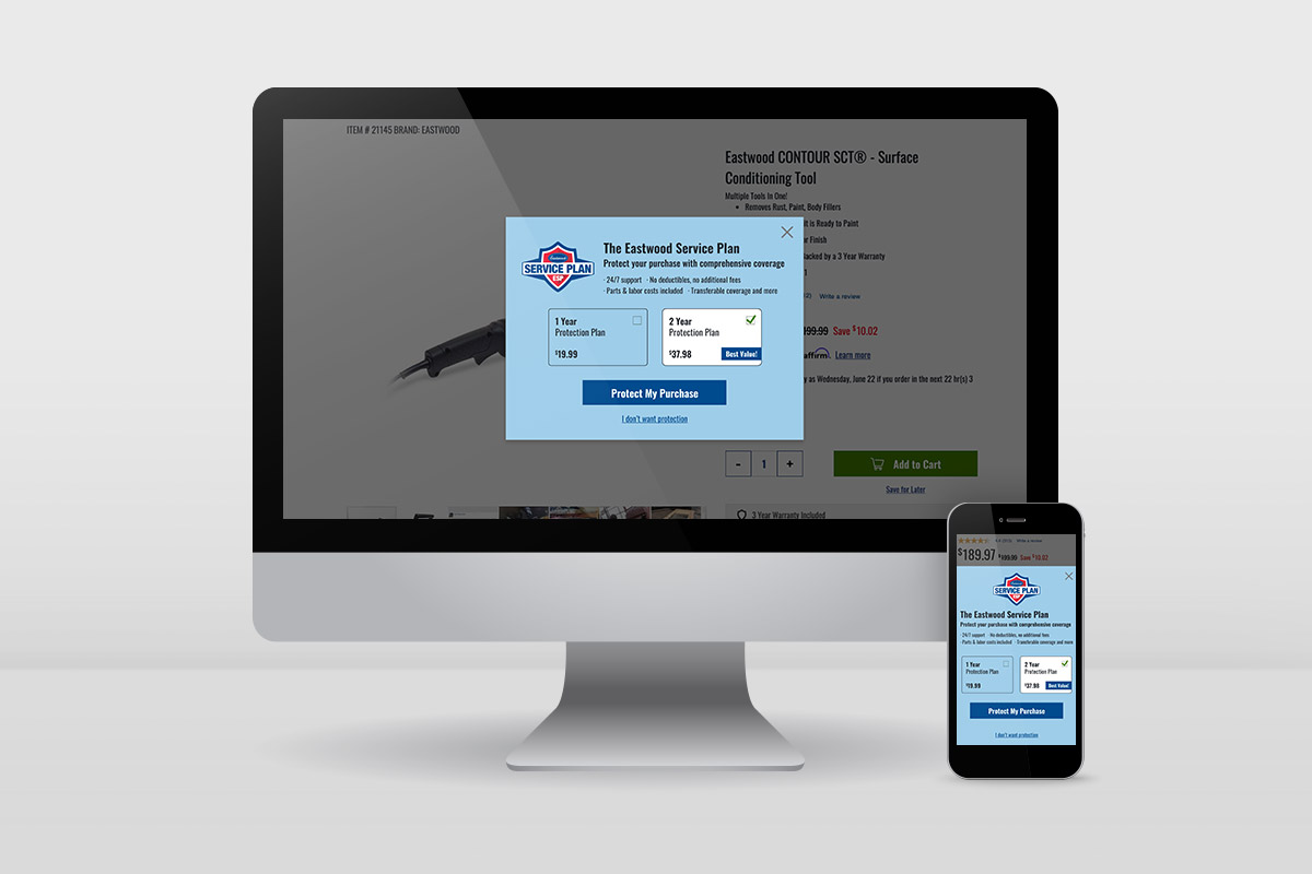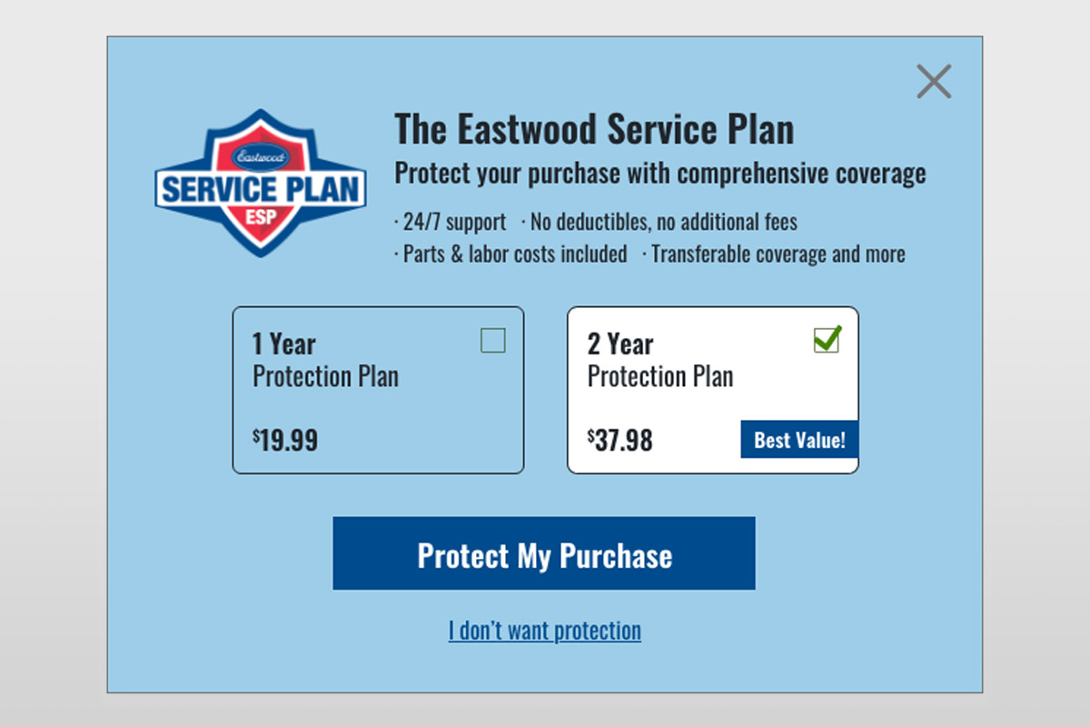 The goal with this project was to increase web sales of the Eastwood Service Plan (ESP): additional protection on top of product warranties. I designed the interstitial in XD with logic to launch once a user adds a product with an ESP plan. This pop-up also brings more awareness to the optional coverage. The 2-year option is selected by default, which has proven to be very effective. I managed the A/B test with this project which included tracking and reporting on results. There was a significant lift in ESP sales on the web, particularly 2-year plans, making this a successful test.