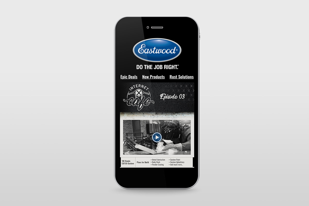 Internet Cafe is a video series where Eastwood transforms a stock 1980 Honda CB750 Custom into a custom cafe racer motorcycle. This series started with a logo design that would represent the build and be featured on YouTube videos and thumbnails, email newsletters and Eastwood's website. With those applications in mind, I also wanted to include a strong cafe racer/motorcycle graphic within the logo since Eastwood's customer base is mostly automotive. From there, I designed a YouTube thumbnail template with specific colors and textures that would be used across all channels.