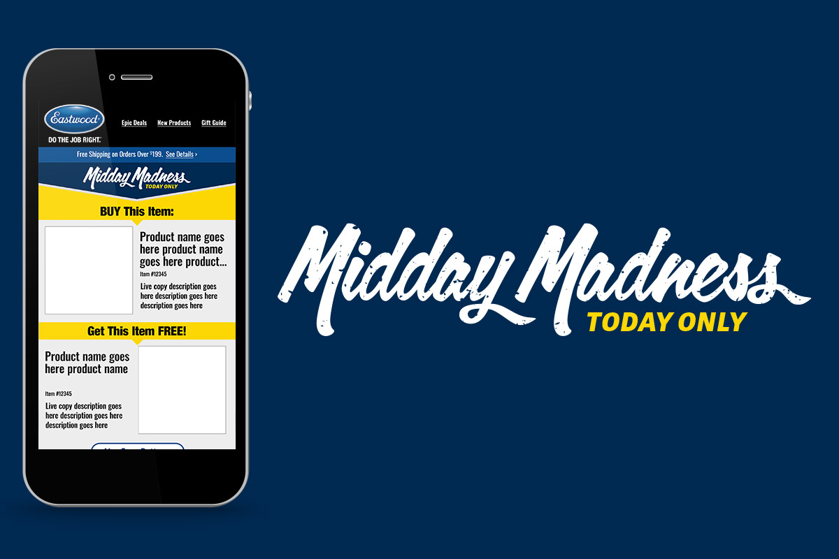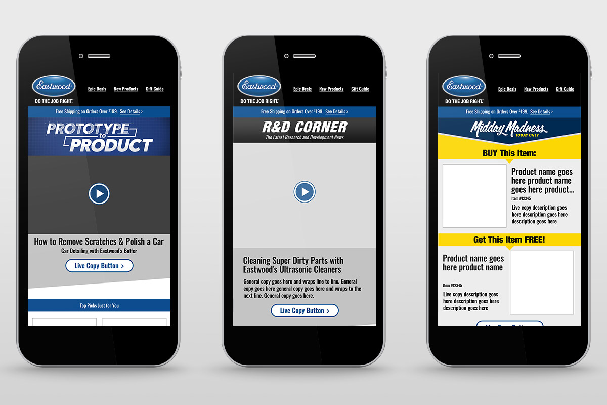 In the beginning of 2022, Eastwood transitioned their email services to a new provider. With this came the opportunity to redesign the emails with the mission to improve processes. Working with the company, myself and the team were able to create several block-based templates that sped up the email creation process. I designed several wireframes and produced many logos and graphics during this transition. Prototype to Product, R&D Corner, Weekend Workshop, Midday Madness and Turbocharged Deals are a few logos I designed for the respective email collections.