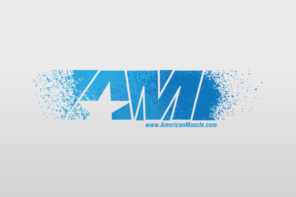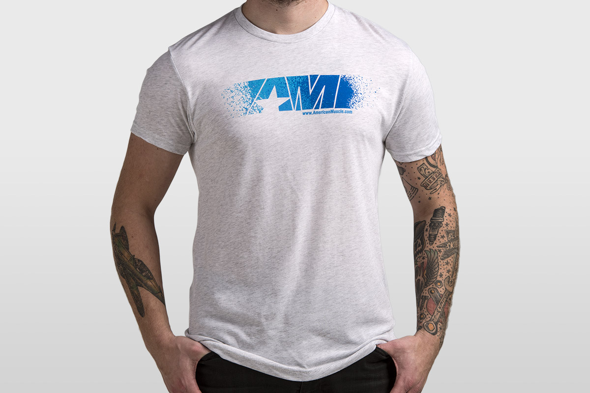 This design includes the AM icon logo and splatter graphics. The splatters include three different shades of blue that fade out on the edges. The name “wet track” links it to the automotive and motorsports industries. This graphic is printed on the front of the tee and features a single colored AmericanMuscle logo on the back for additional branding.